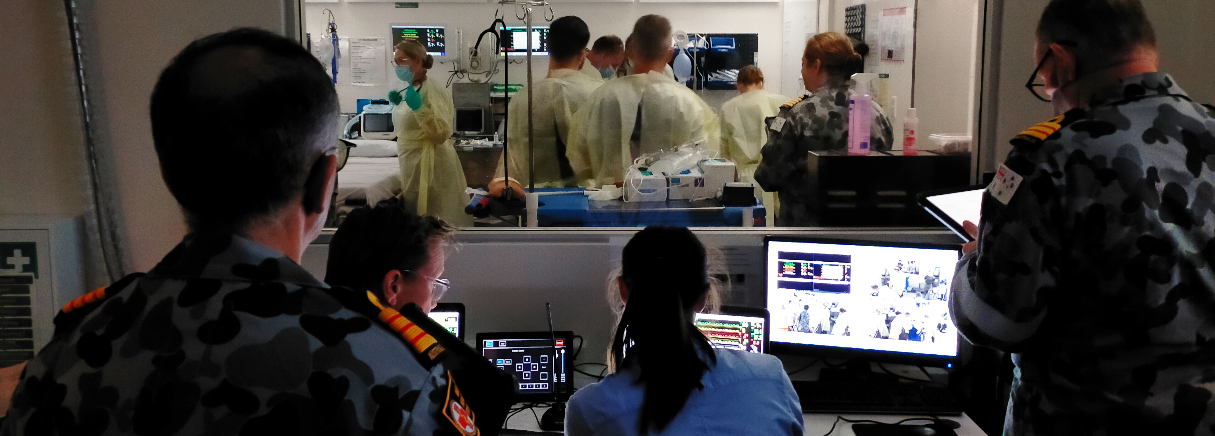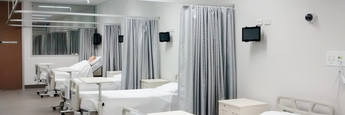Medical simulation centre with three simulation rooms and 18 bed spaces. Single control room with fully independent dual control systems each capable of full system control.