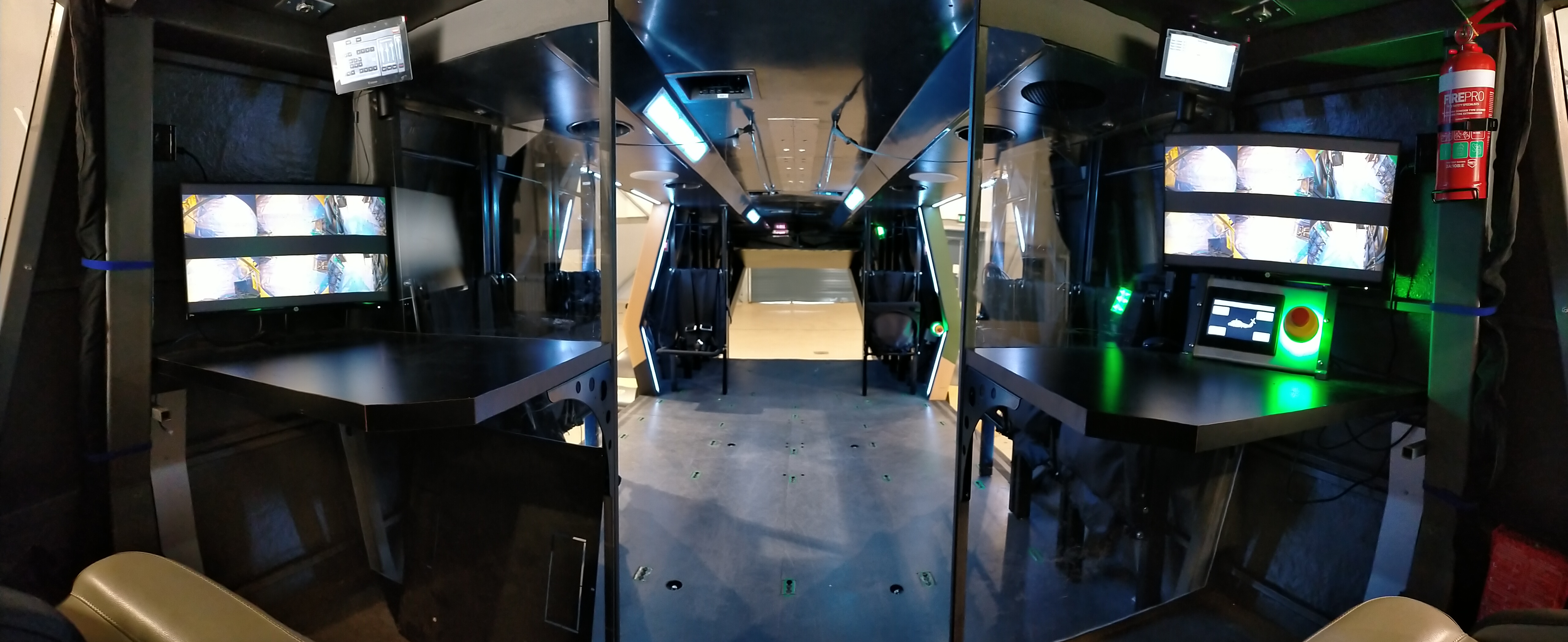 Defence helicopter simulator with custom built multi-channel communications system to replicate military protocols including crew selectable audio settings. Intuitive instructor control system incorporating lighting, ambient sound and video recording controls.