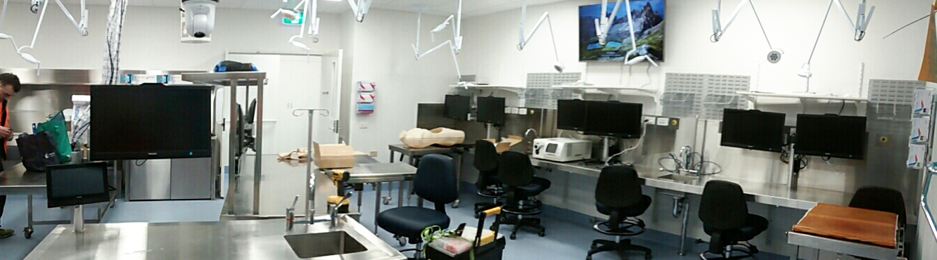 Surgical skills training room with instructor station, eight dual screen student stations, and two large wall mounted screens for presentation. Dual screens at student stations allow for simultaneous display of output at the instructor's discretion. Typically one student screen is set to show output from a PTZ camera monitoring the instructor station, and the other screen shows the output of the student's surgical camera. All screens are integrated with centre distributed audio and video control, including video conferencing system.